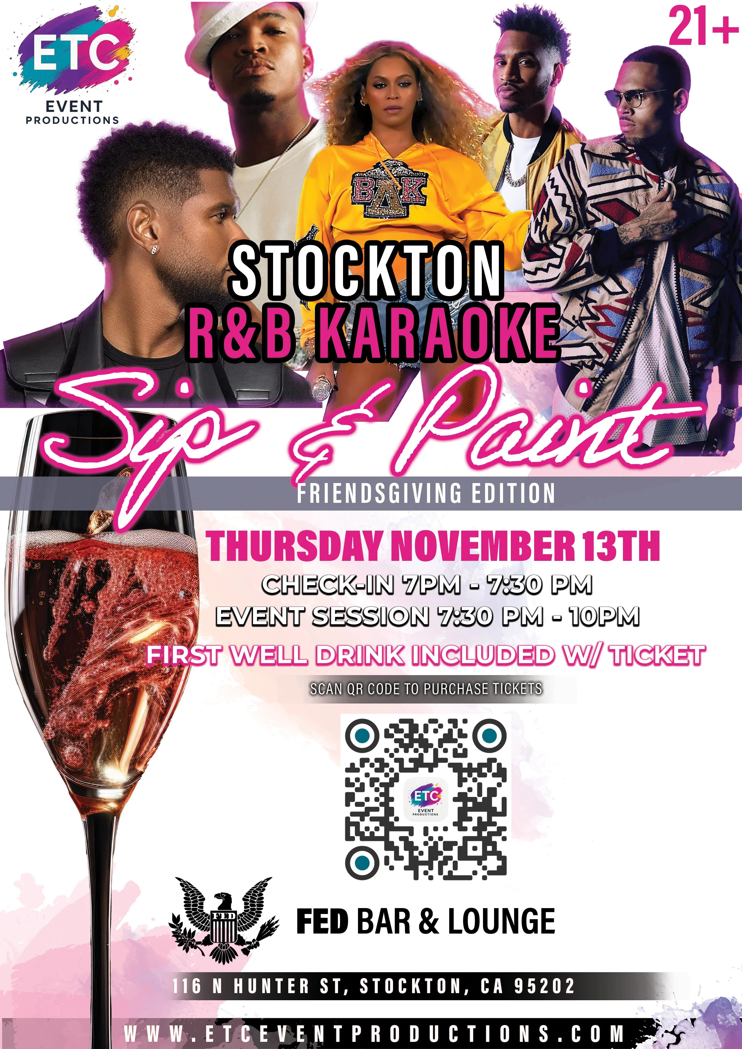 Sip & Paint Night Thursday, November 13, 2025 7:00 PM 10:00 PM FED 116 North Hunter Street Stockton, CA, 95202 United States (map) Google Calendar ICS ETC Event Promotions presents: R&B Karaoke Sip & Paint Night!